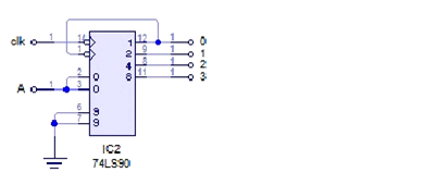 Sebuah IC pembagi 74LS90 membagi keluaran osilator 555 di atas menjadi 10 kode biner 4-bit BCD yang bertambah dari0000 (0 desimal) sampai 1001 (9 desimal), pada keempat kaki-kaki keluarannya (kaki ke-12, 9, 8, dan 11) untuk setiap pergantian keadaan dari 1 ke 0 (high to low transition) padaclock dari output IC timer 555. Perhatikan diagram rangkaian berikut.